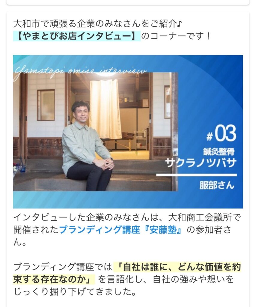 【メディア掲載】月間100万PVの地域サイト「やまとぴ」で紹介されました! 2026.02.18 この記事は約1分で読めます。 いつもマイナス5才肌屋をご利用いただきありがとうございます。 この度、大和市民なら誰もが知っている(?)超人気サイト「やまとぴ」さんに、当店を取材していただきました! 実はやまとぴ、月間100万PV以上も見られたこともある、地域メディアとしては驚異的なサイトなんです。そんな大きなメディアに取り上げていただけて、感激しています。 記事では、当店の[施術内容やお店の雰囲気]をとても素敵にまとめてくださっています。ぜひチェックしてみてくださいね! 記事を見てみる FacebookXBlueskyHatenaCopy